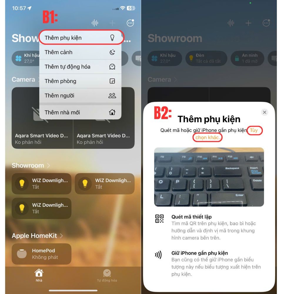 Sau đó, mở ứng dụng hỗ trợ Matter (Ở bài viết này chúng tôi sử dụng ứng dụng Home của Apple), quét mã QR Matter trên sách hướng dẫn hoặc sản phẩm hoặc nhập mã thiết lập để thêm thiết bị vào ứng dụng.