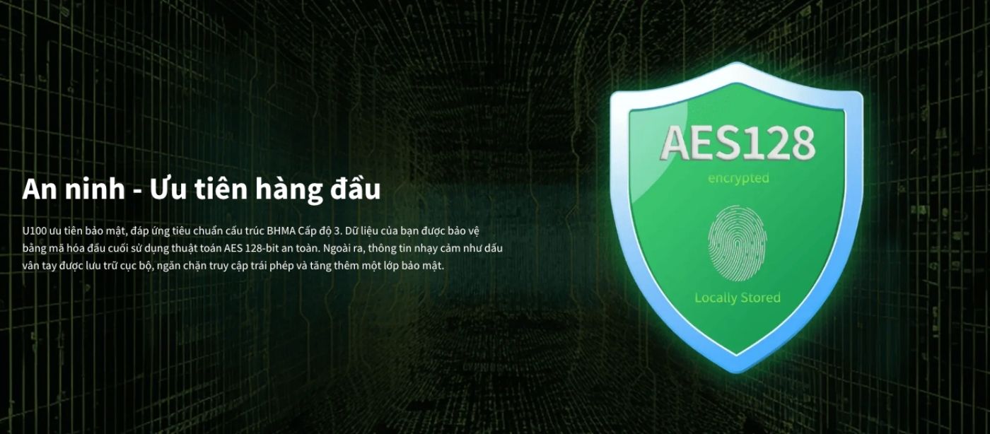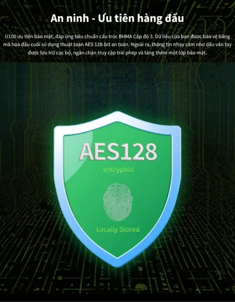 - Bảo mật dữ liệu: Dữ liệu nhạy cảm, bao gồm vân tay, được lưu trữ cục bộ và mã hóa AES 128-bit, ngăn chặn truy cập trái phép.