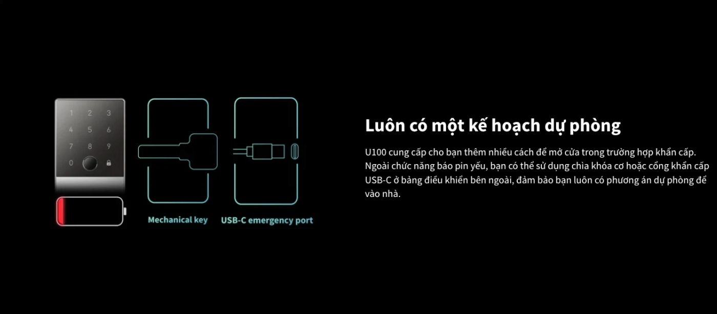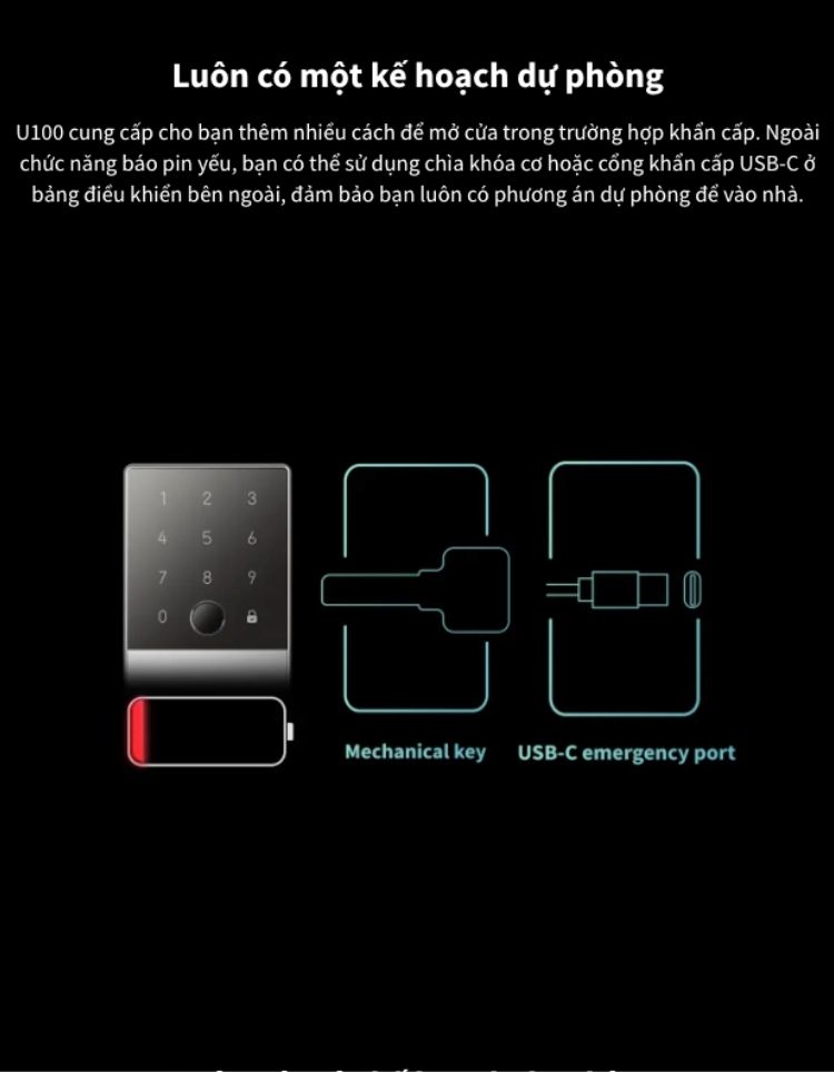 Sạc khẩn cấp: Trang bị cổng USB-C để cấp nguồn khẩn cấp, đảm bảo khóa luôn sẵn sàng hoạt động khi cần.