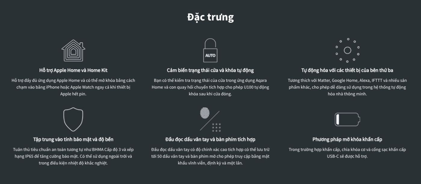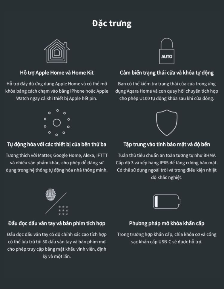 Khóa cửa thông minh Aqara U100 là một trong những khóa thông minh có hỗ trợ Home Key, cho phép mở khóa bằng iPhone hoặc Apple Watch. Ngoài ra, thiết bị cũng tương thích với cả Google Assistant, Apple HomeKit và tương lai sẽ là Matter.