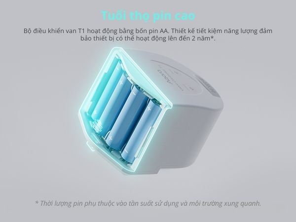 Aqara Valve Controller sử dụng 4 pin AA giúp người dùng dễ dàng lắp đặt ở bất cứ vị trí nào. Và với khả năng tiêu thụ điện thấp, van thông minh nhà Aqara có tuổi thọ lên tới 2 năm.