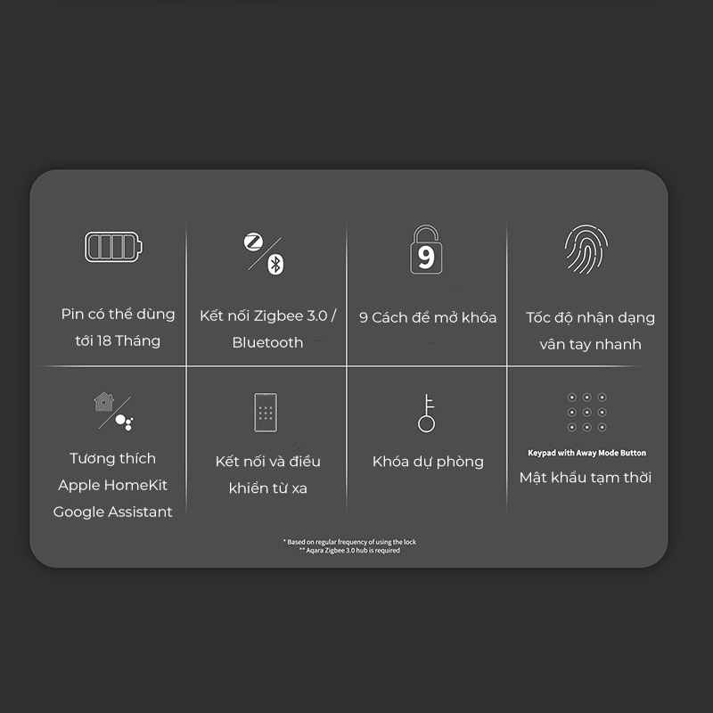 | Cách mở khóa | Chìa khóa cơ, mật khẩu cố định, mật khẩu tạm thời, mật khẩu từ xa, vân tay, thẻ NFC, Aqara Home, Google Home và Apple Home | Vân tay 3D, mật khẩu số, thẻ NFC, Apple HomeKit, Aqara Home và chìa khóa cơ. |